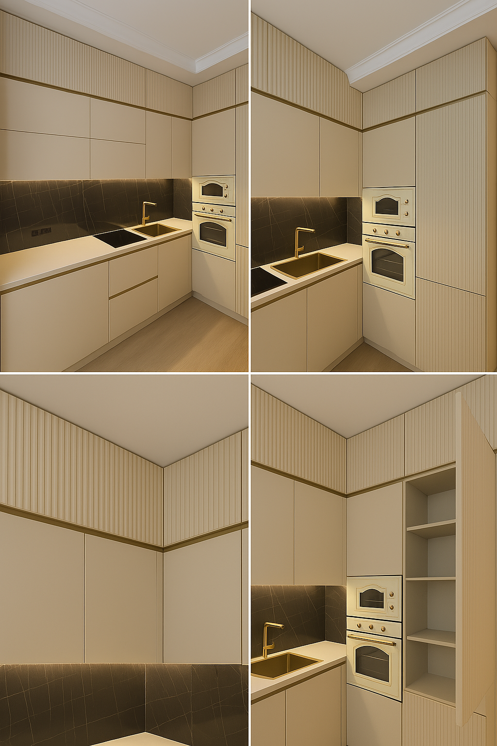 Зависит от размера, материала фасадов и комплектации. Прямые — от 120 000 ₽, угловые — от 180 000 ₽. Точную стоимость считаем бесплатно после замера или по вашим размерам.